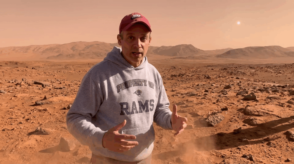Le Prompt magique : Uploade ta photo dans Gemini et demande : « Put the guy on planet Mars walking and talking, he keeps his red cap and grey hoodie