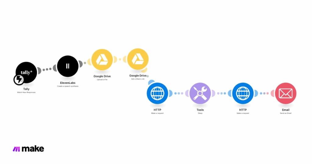 - La Voix (ElevenLabs) : Make envoie le texte à ElevenLabs qui génère l’audio avec ma voix clonée.