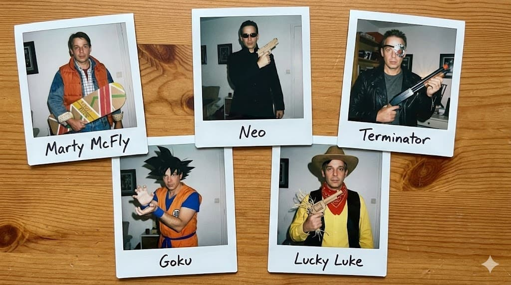 - Les Polaroids : Demandez « 5 polaroids de ce gars dans différents costumes (Terminator, Neo, Lucky Luke) ». L’IA garde votre visage et adapte le reste.
