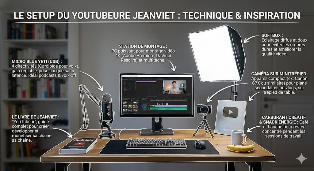J’ai pris une photo de mon setup (bureau, micro, caméra) qui était un peu « en bazar ». J’ai demandé à l’IA de créer une infographie technique. Le résultat est dingue :