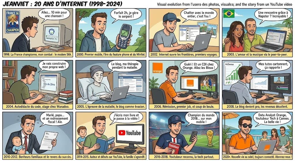 J’ai donné à l’IA le lien de ma vidéo « Draw My Life : 20 ans d’internet » et quelques photos de moi à différentes époques. Le prompt ? « Crée une BD en 12 cases qui raconte cette histoire ».