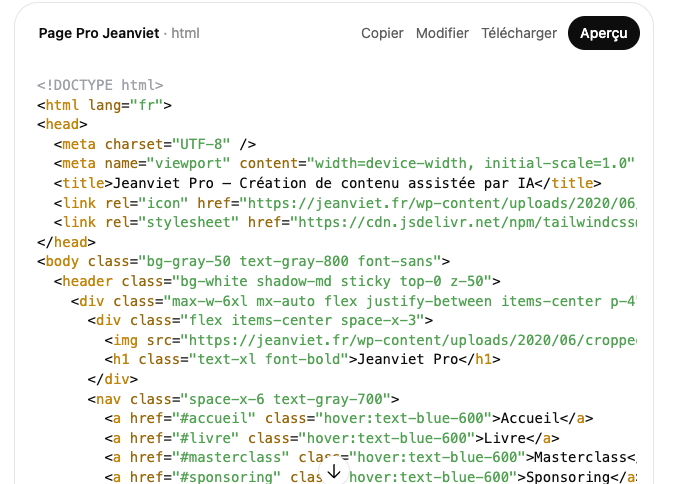 Avec ChatGPT, vous pouvez lui demander du code. Il va vous générer un bloc de HTML/CSS. Mais ensuite, c’est à vous de jouer : il faut copier ce code, le coller dans un éditeur, trouver un hébergeur, l’uploader via FTP… C’est un processus laborieux, surtout si vous n’êtes pas développeur.